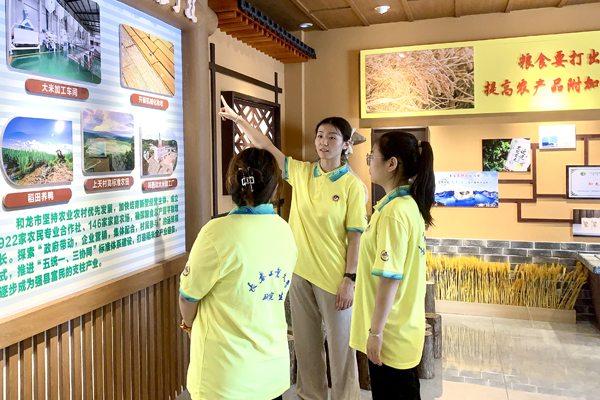 习近平总书记在光东村视察时,沿着田埂步入稻田,察看水稻长势,强调“粮食安全是国家安全的重要基础”“要靠我们自己稳住粮食生产”。近年来,吉林省委、省政府持续推进以吉林大米、吉林鲜食玉米为引领的“吉字号”农业品牌建设工程,吉林粮食品牌快速崛起、优势显现。实践活动期间,正赶上“7·16吉林粮食品牌日暨产销对接活动”在光东村举行。队员们化身游客,参与其中,深度体验吉林粮食品牌精品展、主题文化展、美食品鉴等活动,并接受了吉林广播电视台记者的采访。大家还体验了“稻田小火车”、朝鲜族民俗特色住宿等项目,切身感受到乡村产业蓬勃发展的势头,以及当地“互联网+农业”“农业+旅游业”的乡村振兴创新发展模式为当地带来的巨大发展潜力。