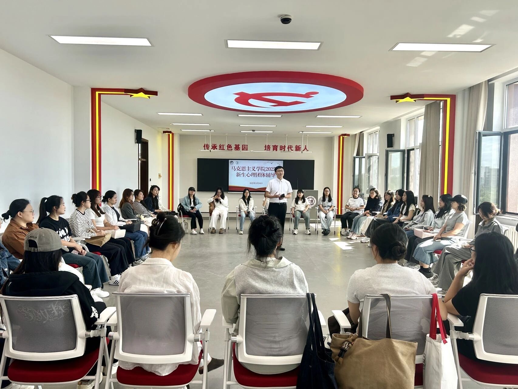 9月16日,学院 2025 级新生心理团体辅导活动在智慧教室I顺利开展。本次活动以 “破冰融情・聚力成长” 为核心目标,由心理健康教育中心教师全程专业主导,全体新生积极参与,现场互动频繁、暖意融融,为新生快速融入集体搭建了良好平台。