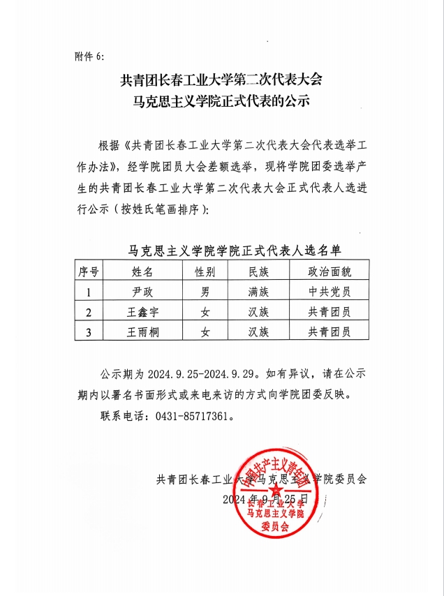 共青团长春工业大学第二次代表大会BEAT365英国官网正式代表的公示
