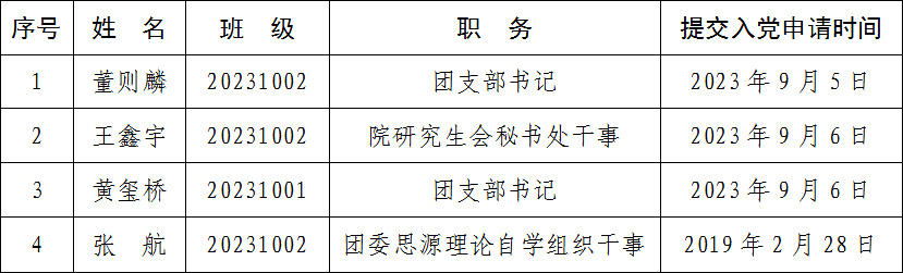 按照发展党员工作有关规定,根据党员推荐和群团组织推优情况,经研究生支部委员会研究,并报学院党委备案,确定董则麟等4名同学为入党积极分子。