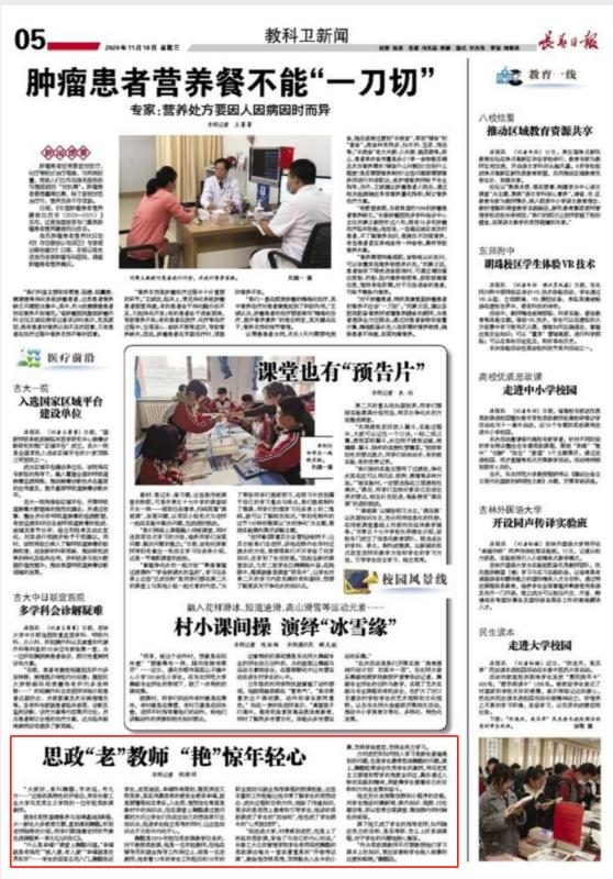 2020年11月16日,《长春日报》第05版刊登了一篇关于我院教师授课情况的文章,题目是《思政“老”教师 “艳”惊年轻心》。文章报道了BEAT365英国官网思政课教师鞠鹏的授课反响,对鞠鹏老师的授课给予了高度赞扬。