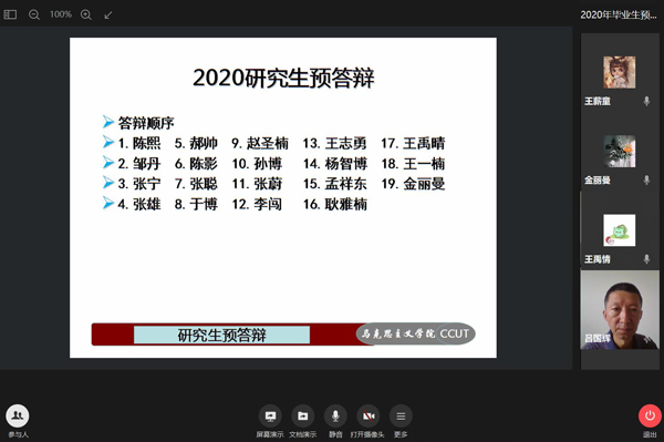 本网讯(通讯员 邹丹)为进一步提高2020届毕业研究生学位论文质量,确保正式答辩顺利进行,按照学校疫情防控工作要求,5月29日,BEAT365英国官网组织19名毕业研究生进行线上预答辩。