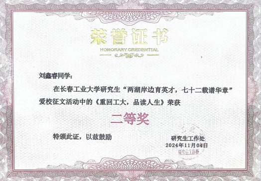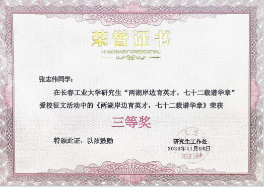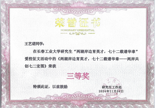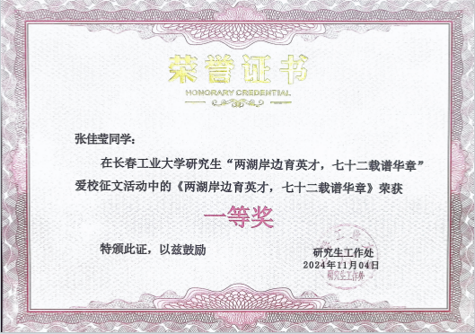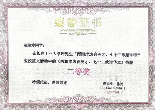 为深入学习宣传贯彻党的二十大精神,教育引导广大青年学子牢固树立爱党爱国、爱校荣校的责任感与使命感,进一步推动中华优秀传统文化传承发展,我院研究生积极参加校研究生工作部(处)开展的“两湖岸边聚英才,七十二载谱华章”主题爱校征文活动,并荣获一等奖一项、二等奖两项、三等奖两项。此次获奖,不仅为学院赢得了荣誉,更是对青年学子爱校情怀的褒奖。