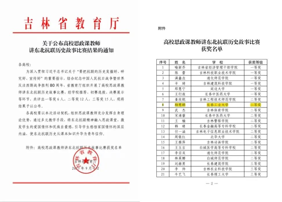 8月31日,吉林省教育厅公布了以“白山黑水颂英烈,思政教师话传承”为主题的高校教师讲东北抗联历史故事大赛的最终成绩。经过全省68所高校近百名参赛教师激烈角逐,我院青年教师杨慧娇讲授的《冰火绝境铸丰碑 白山黑水忆英魂》展示课,荣获二等奖。