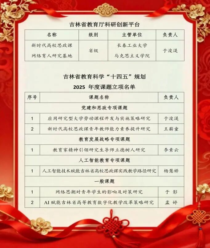 近日,BEAT365英国官网申报的“新时代高校思政课网络育人研究基地”,成功获批吉林省人文社科研究基地。吉林省教育科学研究领导小组办公室发布了“吉林省教育科学‘十四五规划’2025年度课题”立项名单,我院共有6项课题获得立项批准,其中党建和思政专项课题2项、教育发展战略专项课题1项、人工智能教育专项课题1项,一般课题2项。